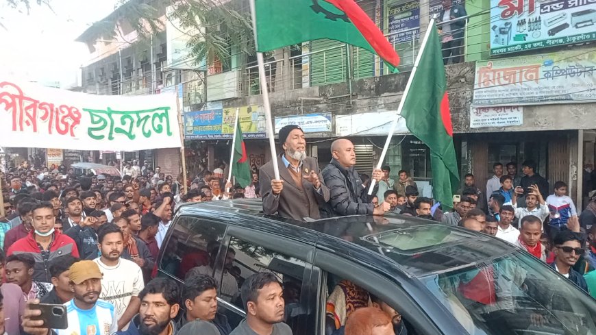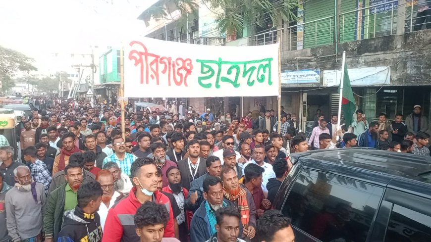 উপজেলা যুবদলের সভাপতি নজমুল হুদা মিঠুর সভাপতিত্বে অনুষ্ঠিত সমাবেশে বক্তব্য দেন, বিএনপি মনোনীত প্রার্থী সাবেক এমপি জাহিদুর রহমান, উপজেলা বিএনপির সাধারণ সম্পাদক জিয়াউল ইসলাম জিয়া, জেলা আইনজীবী সমিতির সভাপতি জয়নাল আবেদিন, পৌর বিএনপির সভাপতি রুহুল আমিন, সাধারণ সম্পাদক রেজাউল করিম রাজা, উপজেলা শ্রমিক দলের সভাপতি আশরাফুল ইসলাম, উপজেলা যুগ্ম সাধারণ সম্পাদক জিল্লুর রহমান জুয়েল, পীরগঞ্জ সরকারি কলেজের সাবেক ভিপি আসাদুজ্জামান চৌধুরী মানু, উপজেলা মহিলা দলের আহ্বায়ক কুলসুম বেগম, সদস্য সচিব মাহফুজা বেগম, বিএনপি নেতা ওয়ালিউর রহমান মিঠু, উপজেলা যুবদলের সাধারণ সম্পাদক দিদারুল ইসলাম রানা, ছাত্রনেতা মেজবাহুল হক সূর্য, রবিউল ইসলাম প্রমুখ। সমাবেশে পৌরসভা ও ১০টি ইউনিয়ন বিএনপি, যুবদল, স্বেচ্ছাসেবক দল, শ্রমিক দল, ছাত্রদল ও মহিলা দলের কয়েক হাজার নেতা-কর্মী ও সমর্থক অংশ নেয়। শেষে ঢাকায় হাদীর উপর হামলার প্রতিবাদে বিক্ষোভ মিছিল বের করা হয়। মিছিলটি শহরের বিভিন্ন সড়ক প্রদক্ষিণ করে।