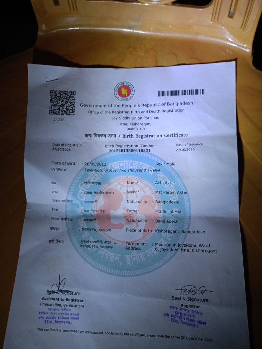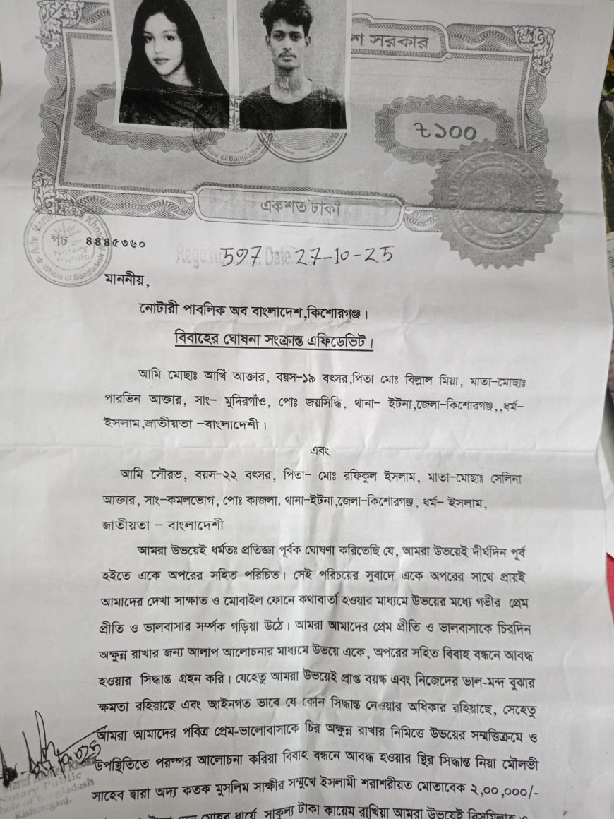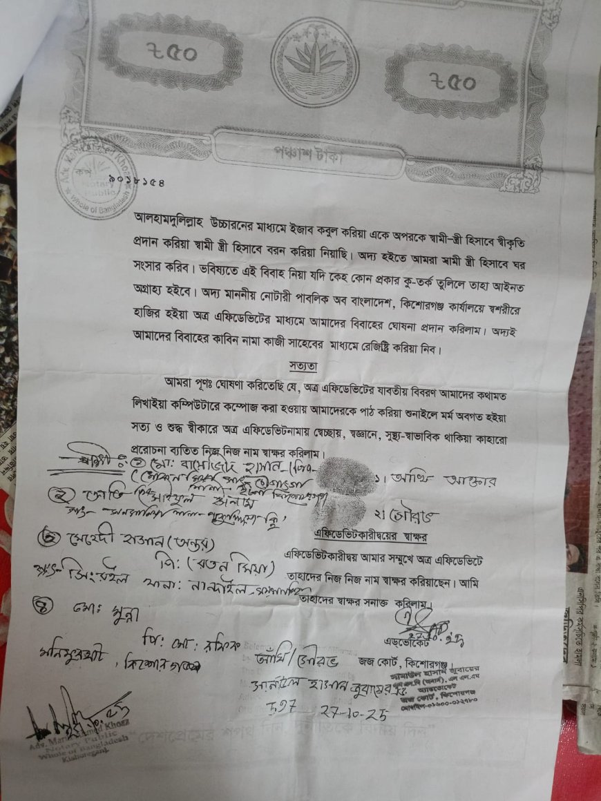 আঁখি আক্তার এর জন্ম তারিখ ২০/১২/২০১২ জন্ম সনদ নং ০০০০০০০ গোপন করে একটি এভিডেভিড করেন। কিশোরগঞ্জ জজকোর্টের এডভোকেট সামাউল হাসান জুবায়ের ও এড. মারুফ আহম্মেদ খান ২৭/১০/২০২৫ ইং এভিডেভিড রেজিঃ নং ৫৯৭ বিবাহ ঘোষণা সংক্রান্ত নোটারী পাবলিক চুক্তিনামা তৈরী করেন যেখানে মোছাঃ আঁখি আক্তার এর বয়স দেখানো হয় ১৯ বছর। দুইলক্ষটাকা দেনমোহর ধার্য্য করতঃবিবাহ কবুলিয়াত চুড়ান্ত করেছেন। উক্ত চুক্তিতে ৪ জন স্বাক্ষীর স্বাক্ষরও রয়েছে। এ ব্যাপারে কিশোরগঞ্জ সদর মডেল থানার উপপরিদর্শক (নিরস্ত্র) মোঃ আমিনুল ইসলাম এ প্রতিনিধি কে বলেন ভিকটিম কে পিতার জিমায় রাখা হয়েছে। অতিসও্বর আইনগত ব্যবস্হা সহ আসামীদের গ্রেফতার করা হবে।