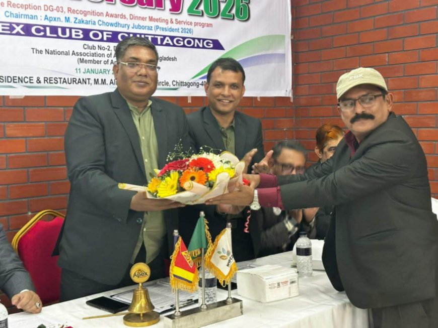 আন্তর্জাতিক সেবা সংগঠন এপেক্স ক্লাব অব চট্টগ্রাম এর উদ্যোগে ডিনার মিটিং, ডিজি ইলেক্ট–২০২৬ কে বরণ, প্রতিষ্ঠাবার্ষিকী উদযাপন ও মানবিক সেবা কার্যক্রম অনুষ্ঠিত হয়েছে।