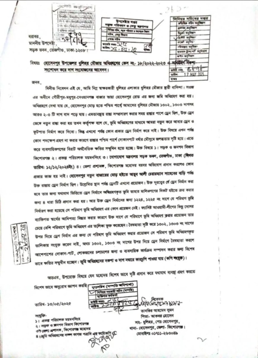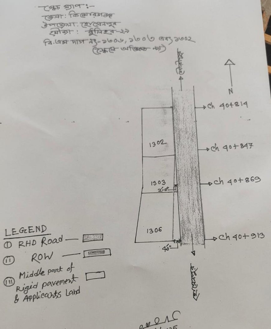 বিএস দাগ ১৩০২-০৩ দাগে ৬০ ফুট জায়গা সরকারিভাবে অধিগ্রহণ করা হলে মালিক পক্ষের সম্মতি রয়েছে বলে জানা গেছে।কিন্তু সওজ কর্তৃপক্ষ এল.এ কেস্ নং ১৮/২০২২-