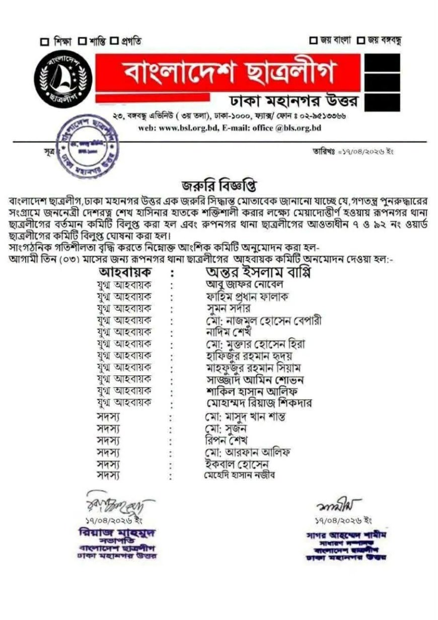 ঢাকা মহানগর উত্তর ছাত্রলীগের প্যাডে গত ১৭ তারিখ অন্তর ইসলাম বাপ্পী'কে আহবায়ক করে রুপনগর থানা ছাত্রলীগের নতুন কমিটি গঠন করা হয়।
