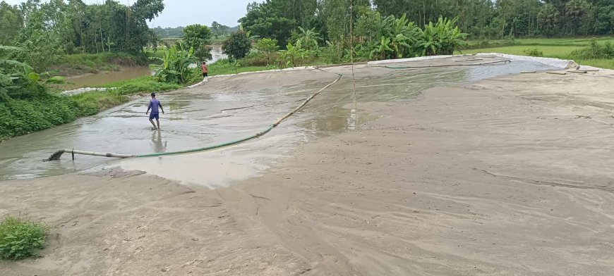 আজম নগর খাল থেকে অ'বৈ'ধ বালু উত্তোলনের ফলে বিলীন হচ্ছে শত শত একর ফসলি জমি এবং হুমকিতে আছে খালের উপর ব্রিজ।