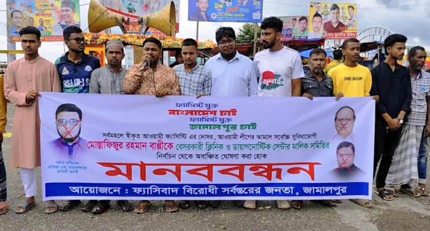 আজ দুপুরে শহরের ফৌজদারি চত্বরে ফ্যাসিবাদ বিরোধী সর্বস্তরের জনগণের ব্যানারে আয়োজিত মানববন্ধন থেকে এ ঘোষণা দেওয়া হয়েছে। এ সময় বক্তারা অভিযোগ করেন, বাংলাদেশ ব্যাংকের সাবেক গভর্ণর ড. আতিউর রহমানের ভাতিজা মোস্তাফিজুর রহমান বাপ্পী আওয়ামী লীগ সরকারের আমলে সর্বোচ্চ সুবিধাভোগী ছিলেন। জেলার সরকারি বেসরকারি স্বাস্থ্য বিভাগ তিনি জিম্মি করে রেখেছিলেন। আগামী ৪ অক্টোবর জামালপুর জেলা বেসরকারি ক্লিনিক ও ডায়াগনস্টিক সেন্টার মালিক সমিতির নির্বাচনে সভাপতি পদে নির্বাচন করছেন তিনি। ঘন্টাব্যাপী অনুষ্ঠিত মানববন্ধনে বক্তব্য রাখেন বৈষম্য বিরোধী ছাত্র আন্দোলন জামালপুর জেলা শাখার সাবেক যুগ্ম আহ্বায়ক আদল হাসান সূচক, সাবেক যুগ্ম সদস্য সচিব আমিমুল ইহসান ও সাবেক সিনিয়র যুগ্ম সদস্য সচিব আহাদ হোসেন। মোস্তাফিজুর রহমান বাপ্পীকে গ্রেপ্তারের দাবিতে গত ২৮ সেপ্টেম্বর একস্থানে মানববন্ধন করেছে ফ্যাসিবাদ বিরোধী ছাত্র জনতা। মেহেদী হাসান জামালপুর। ০২.১০.২০২৫
